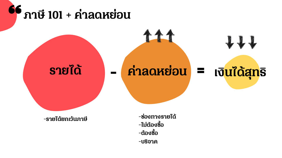 หากแสดงให้เห็นภาพรวมคือ ยิ่งเรามีรายได้เยอะ เงินได้สุทธิ(เงินที่จะต้องนำไปคำนวณภาษี) ก็จะเยอะขึ้นตาม ดังนั้นวิธีที่จะทำให้เราเสียภาษีให้น้อยที่สุด คือการซื้อค่าลดหย่อนให้เยอะเข้าไว้ แต่ก็ต้องซื้อให้เหมาะสมกับไลฟ์สไตล์และเป้าหมายทางการเงิน/เป้าหมายชีวิตเราด้วยนะ ซึ่งเดี๋ยวฟลุคจะยกตัวอย่างให้ดูใน paragraph ต่อๆไป