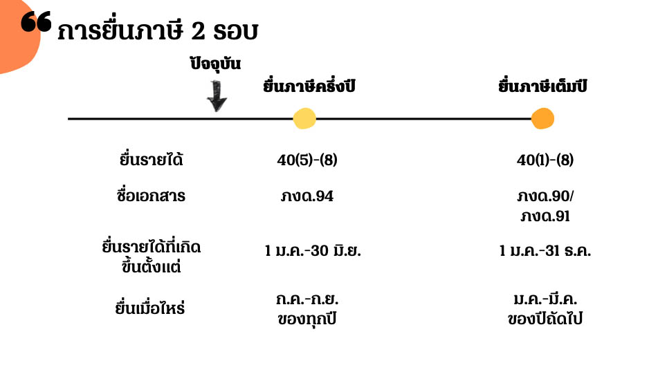 หลังจากที่เรายื่นภาษีครึ่งปีไปแล้ว เราจะต้องยื่นภาษีเต็มปีอีกครั้ง โดยเราจะต้องนำรายได้ “ทุกประเภท” มาคำนวณรวมกันใหม่อีกรอบ เพราะการยื่นภาษีครึ่งปีเป็นการคำนวณรายได้แค่ 40(5)-40(8) แต่การยื่นภาษีแบบเต็มปีเป็นการคำนวณเงินได้เพื่อเสียภาษีของรายได้ทุกประเภท 40(1)-40(8) ถ้าอธิบายให้เห็นภาพคือการคำนวณภาษีเต็มปีเป็นเหมือนการ “ล้างไพ่“